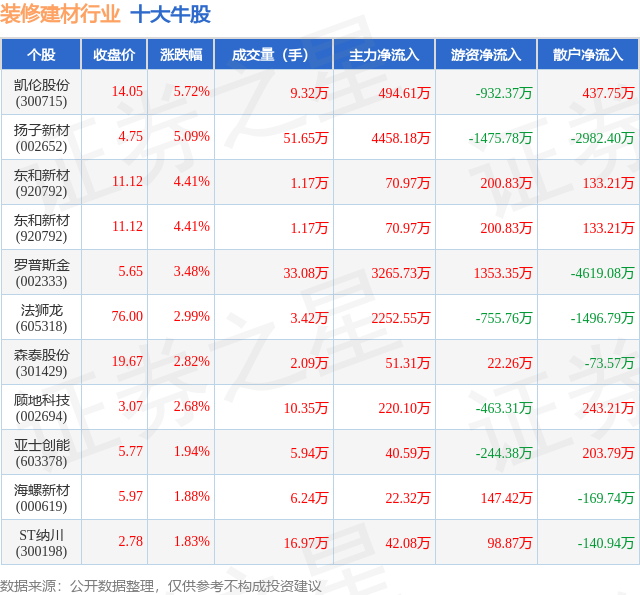 个股表示方面,拆建筑材行业当日领涨股为凯伦股份(300715),该股当日报收14。05,上涨5。72%,成交量9。32万,从力资金净流入494。61万元。扬子新材(002652)以上涨5。09%紧随其后,该股当日成交量51。65万,从力资金净流入4458。18万元。除此之外,东和新材(920792)、东和新材(920792)、罗普斯金(002333)均进入当日牛股之列。具体个股列表见下表!